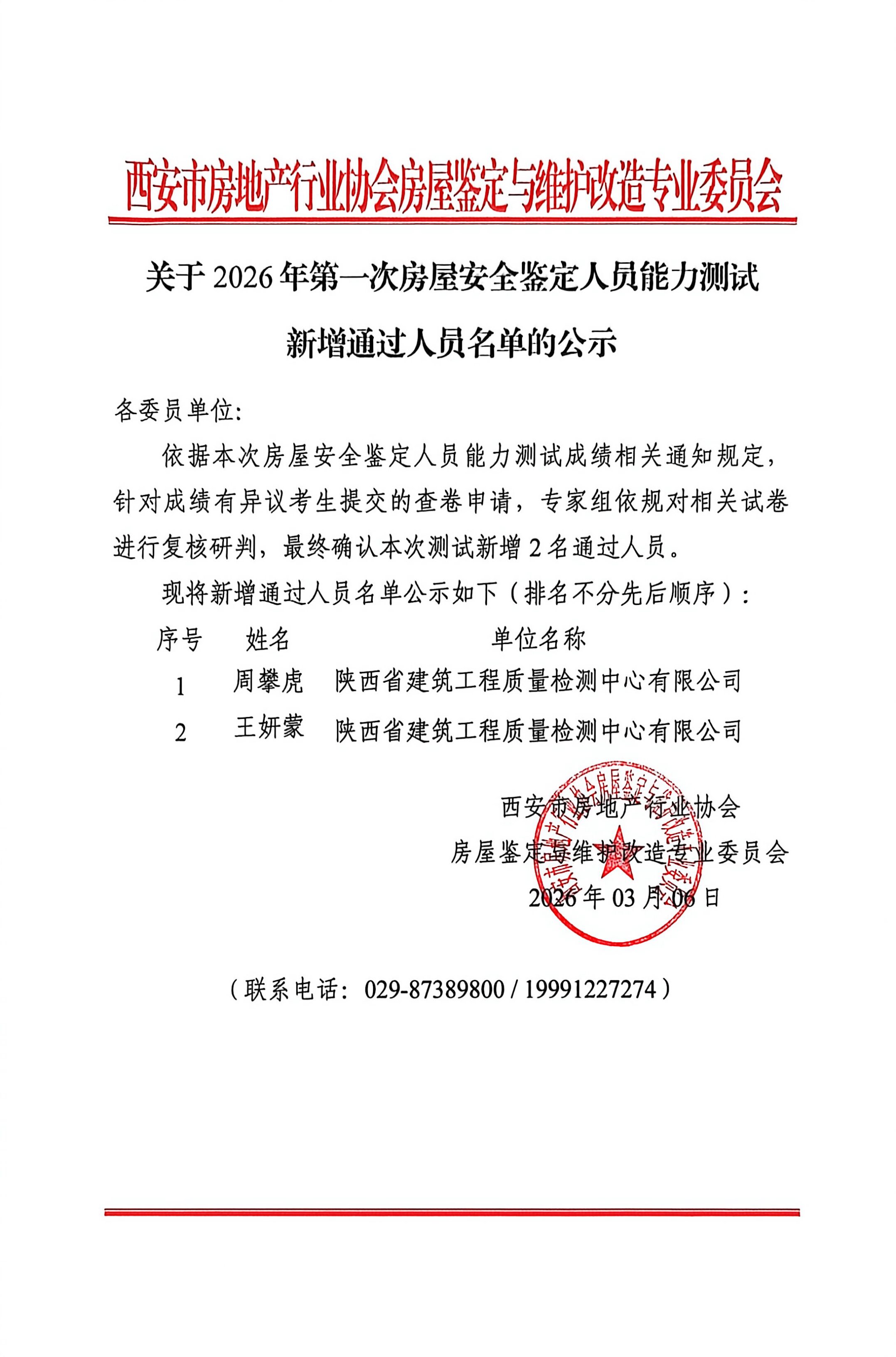 关于2026年第一次房屋安全鉴定人员能力测试新增通过人员名单的公示